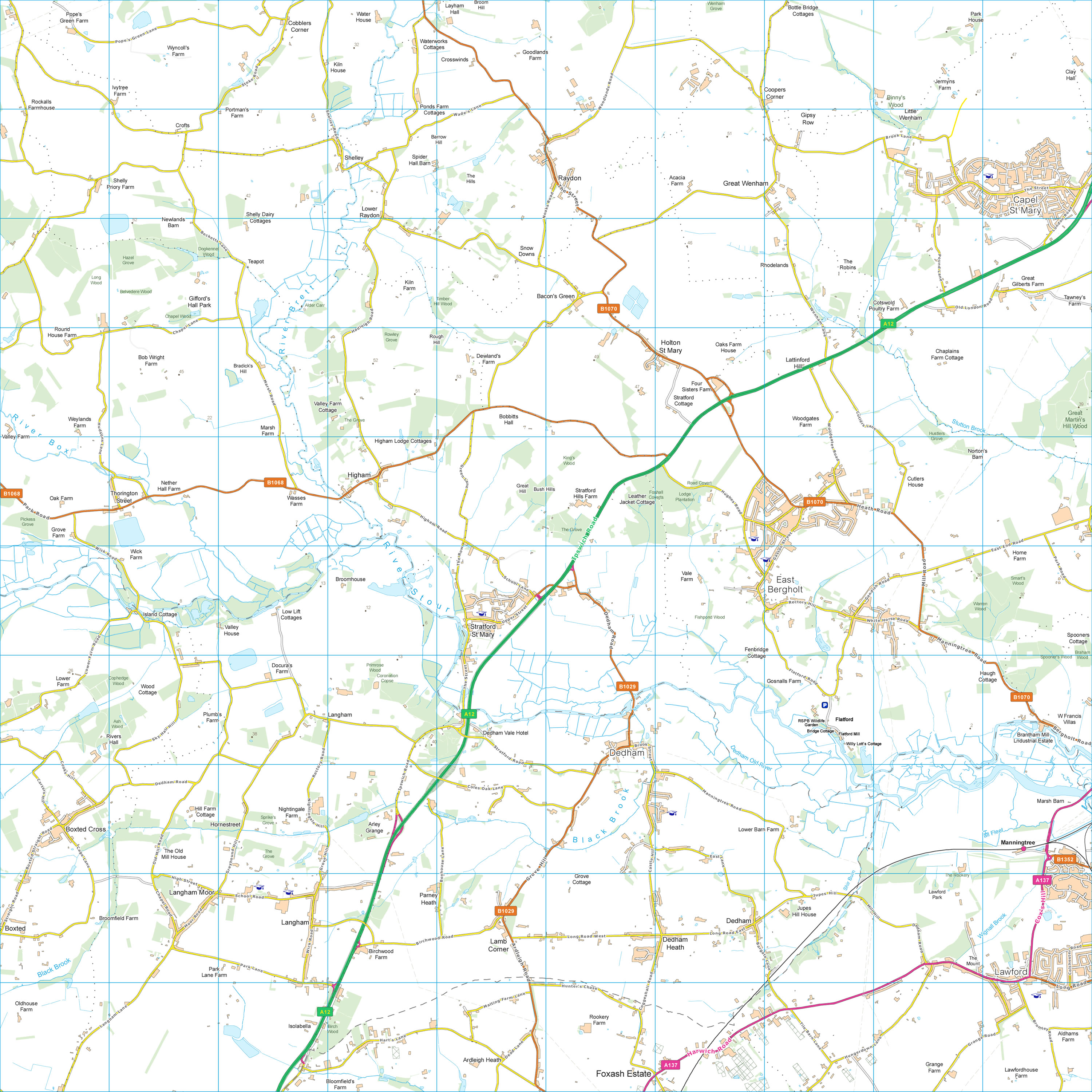 View or download these maps of Suffolk for FREE. We have maps at various scales showing different places in Suffolk, including town & village street maps, district maps and a Suffolk county map. These maps are based on Ordnance Survey Open Data, which are made available under a Open Government Licence (OGL). These maps have been enhanced to show tourist information and made available on our website for free download. Please note that footpaths shown are approximate.