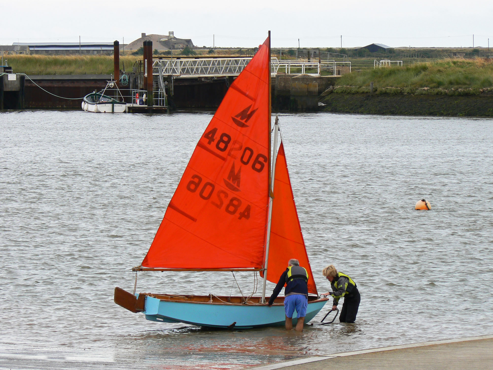 Launching a Mirror dinghy at Orford |